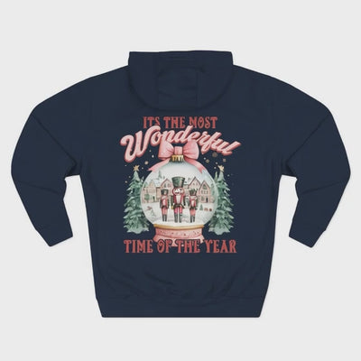 Vintage Preppy Pink Snow globe design on a Three-Panel Fleece Hoodie, giving off a cozy and festive vibe. Perfect for those who love the holiday season and want to feel warm and stylish at the same time. Ideal for Christmas celebrations and winter gatherings.