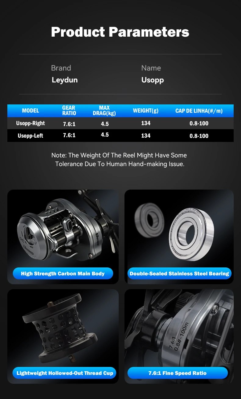 The Leydun New DC Usopp baitcasting reel delivers professional-grade performance in an ultralight 134g design. Engineered with a 7.6:1 gear ratio, the Leydun New DC Usopp accelerates your retrieval for responsive casting control. The Leydun New DC Usopp features an impressive 4.5kg drag power, handling medium-weight catches with precision. Built for serious anglers, this Leydun New DC Usopp baitcaster combines advanced mechanics with ergonomic balance. The Leydun New DC Usopp excels in both freshwater and saltwater applications, offering reliability when it matters most. Experience the difference with Leydun New DC Usopp technology—engineered for accuracy, durability, and consistent performance on every cast.